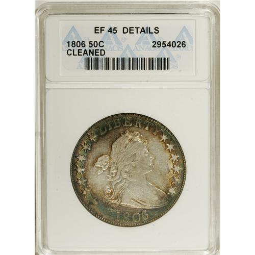 <B>1806/5 50C --Cleaned--ANACS. XF45 Details.</B></I> O-102, High R.3. Dramatic sea-green and orange-gold toning embraces the borders. A lightly cleaned piece with substantial luster and splendid portrait detail.<BR><I>From The Hoosier Discovery Collection.</B></I><BR><BR><b>Shipping:</b> Coins & Currency (<a target="_blank" href="http://www.heritageauctions.com/common/shipping.php">view shipping information</a>)