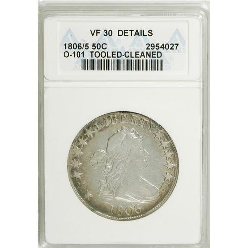<B>1806/5 50C --Cleaned, Tooled--ANACS. VF30 Details.</B></I> O-101. NGC Census: (40/105). PCGS Population (10/69). Numismedia Wsl. Price: $690. (#6077)<BR><BR><b>Shipping:</b> Coins & Currency (<a target="_blank" href="http://www.heritageauctions.com/common/shipping.php">view shipping information</a>)