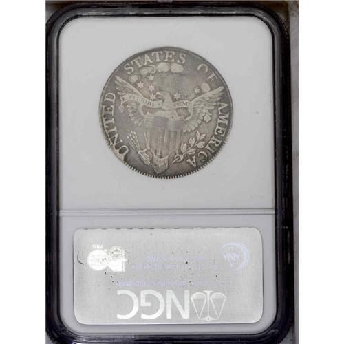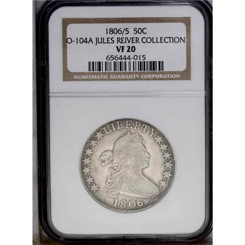 <B>1806/5<50C> VF20 NGC.</B></I> O-104a, R.5. The diagnostic die crack of O-104 that joins the outer points of the last three stars becomes heavier on the 104a and extends through the lower drapery on the bust, connecting to the rim at 5 o'clock. A branch joins the rim at the bust tip. Also, the crack above UNITE is much heavier, and a large rim break has formed over UN. The relatively clean surfaces of this VF specimen display silvery centers that transition into charcoal-gray, electric-blue, and golden-brown patination around the borders.<BR><I>Ex: Jonathan Kern (11/1990).</B></I> Envelope Included.