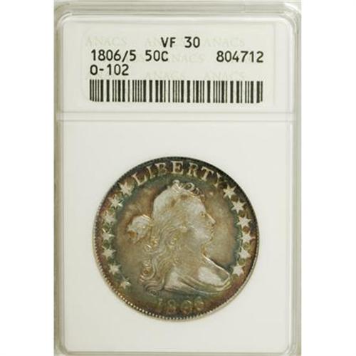 <B>1806/5 50C VF30 ANACS.</B></I> O-102, High R.3. Apple-green, rose, and sea-green toning endows the peripheries of this middle-grade example. Despite moderate wear on the devices, traces of luster are still evident in protected areas.<BR><BR><b>Shipping:</b> Coins & Currency (<a target="_blank" href="http://www.heritageauctions.com/common/shipping.php">view shipping information</a>)