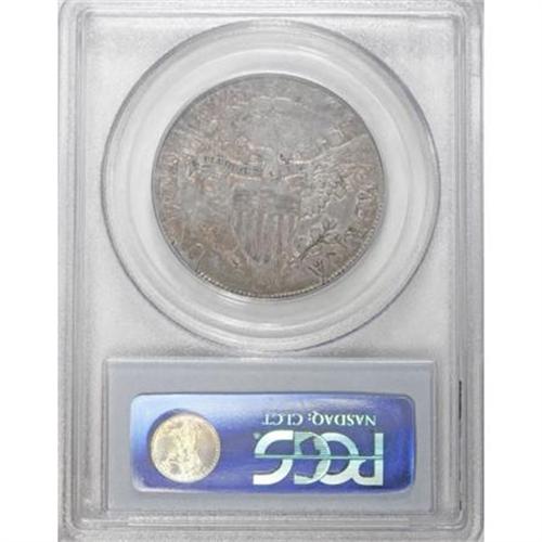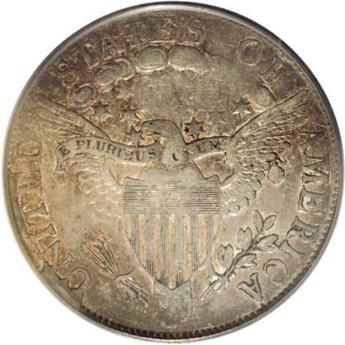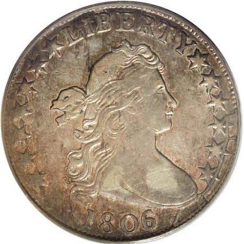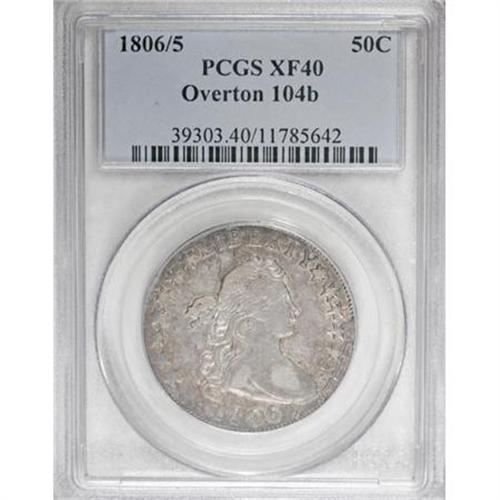 <B>1806/5 50C XF40 PCGS.</B></I> O-104b, R.5. Probably R.7 as a die state. Few obverse / reverse die combinations have a terminal die state that results in retained die cuds on each side. This is a spectacular and highly collectible die state with few examples known. In this state, the small die cud over U has expanded to also cover half of N. There is also a longer cud over the right portion of I and covering the tops of TE. All the obverse die cracks on O-104a are seen here but are much heavier on this piece. There are three separate but related retained cuds from star 11 to below the bust of Liberty. The rim-to-rim break over star 11 is more advanced than the other two and is nearly a full cud.<BR> The surfaces on this piece are richly toned in shades of gray and golden-rose with bright, silvery accents over the highpoints where wear is most evident. Softly struck overall with the usual weakness on the reverse on the eagle's head and upper stars. <BR> Only four examples of the ‘b' variant are recorded in Herrman's listing of auction appearances. The finest was the third edition Overton plate coin, an NGC XF40, a piece that was withdrawn from a Downey Mail Bid Sale in 1993. Inspection of the plate coin from that edition shows that this is a different example. Thus, there are two coins known at the 40/40 grade level that are currently tied for finest known for this die state. The other three pieces recorded are 20/20, 20/20, and 15/15.<BR> PCGS #6077, Encyclopedia-4582.<BR><I>Ex: Michael Summers.<BR>From The Westmoreland County Collection of Early Bust Halves, 1794-1807.</B></I><BR><BR><B>Coin Engraver:</B> Robert Scot<BR><BR><b>Shipping:</b> Coins & Currency (<a target="_blank" href="http://www.heritageauctions.com/common/shipping.php">view shipping information</a>)