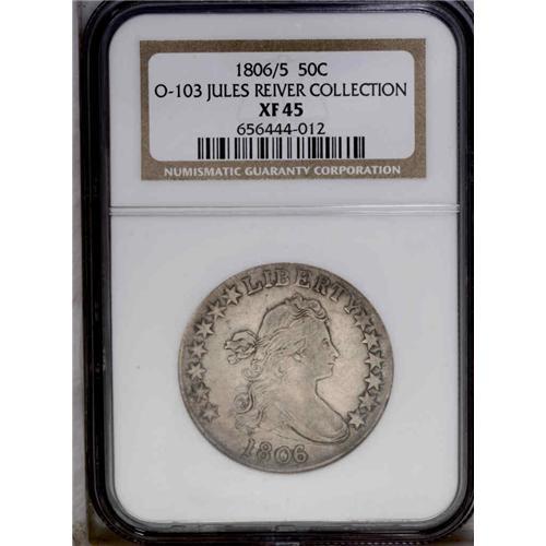 <B>1806/5<50C> XF45 NGC.</B></I> O-103, R.2. An early die state without any obverse or reverse die cracks. This variety, an advanced state of the obverse die employed in O-101 and O-102, displays little or no obverse milling. Only the two lower outside berries in the branch have stems. Silver gray surfaces on the present coin are a touch brighter on the obverse, and are quite pleasing for a coin at this grade level.<BR><I>Ex: Don Horton (10/1979).</B></I> Envelope Included.