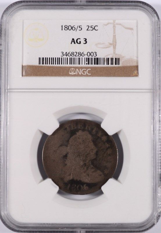 1806/5 BUST QUARTER, NGC AG-3, SCARCE EARLY DATE OVER DATE