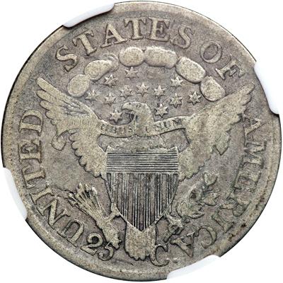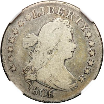 1806/5 Draped Bust Quarter Dollar. NGC graded Good-6 Browning-1. Light toning. A nice clear overdate on this popular early draped bust, heraldic eagle quarter dollar. In a new 4 prong NGC holder.