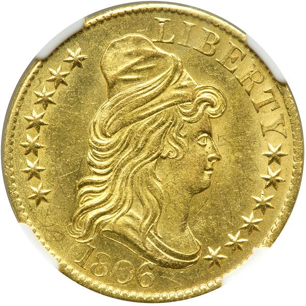 1806 $5 Capped Bust. Round 6. . BD-6, Breen-6448. NGC graded MS-64. Nicely struck on a problem free planchet with untoned frosty mint surfaces throughout. A desirable Red Book variety, this obverse shows the stars arranged 7 and 6, the date has its round-top 6 firmly upon the truncation of the bust. The reverse field is hallmarked by a short line, possibly a lint mark, above the last A in AMERICA, and only the lightest adjustment marks appear at the upper right rim through STAT. The principal devices on both sides are marvelously detailed with only minor weakness seen on the left side of the shield, all complemented by deep, frosty glowing luster. Conventional wisdom has it that the Knob 6 variety is somewhat more accessible than the Pointed 6 but prices realized from auctions show close for the two main varieties.