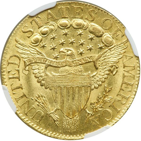 "As with the 1806 half dollars, the Pointed 6 half eagle varieties had the obverse die in the hammer and the reverse die in the anvil position. For the Knobbed 6 half dollar issues and this half eagle variety this die alignment was reverse, resulting in better struck obverses." Pop 50; 2 in 65.