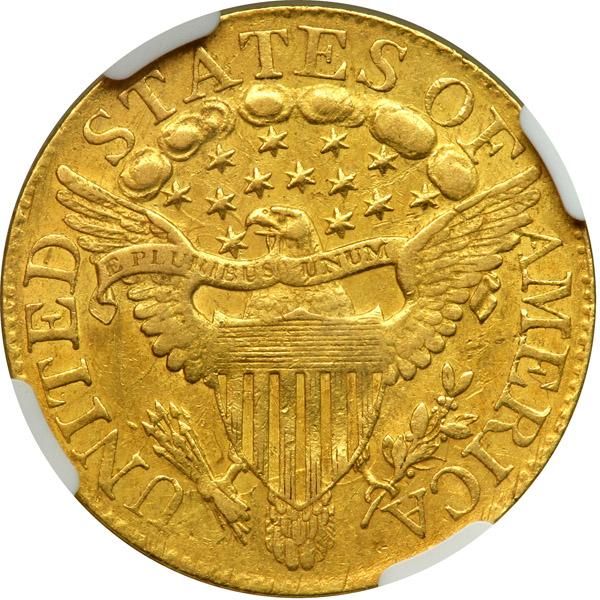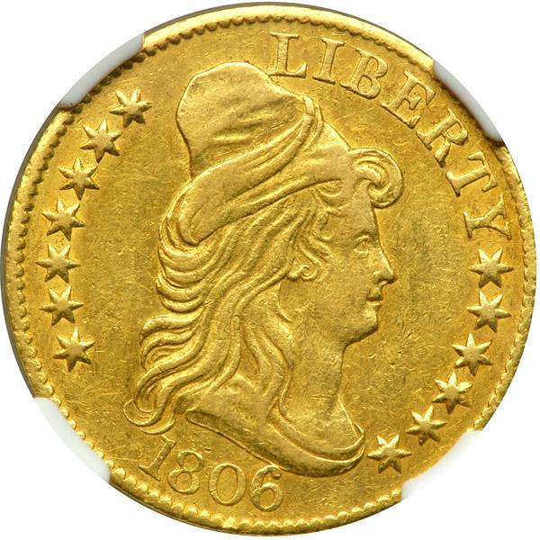 1806. Round 6. . BD-6, Breen-6447. NGC graded AU Details improperly cleaned. Some mint frost remains, lightly toned. Although this is by far the most commonly found 1806 Capped Bust, Large Eagle fie, and also the most seen variety amopng all the Draped Bust coins, it remains as the only die variety with the Round or Knobbed top 6 in the date. Dannreuther places the rarity at R-2, implying that 600 to 900 are known; in the 1990-2005 period covered by his Auction Appearances data, 323 were auctioned. Stars are layed out 7 + 6, which is key, as the only use of this obverse. The reverse is carried over from BD-5, one of the Pointed 6 varieties.