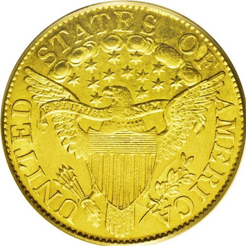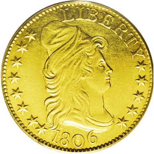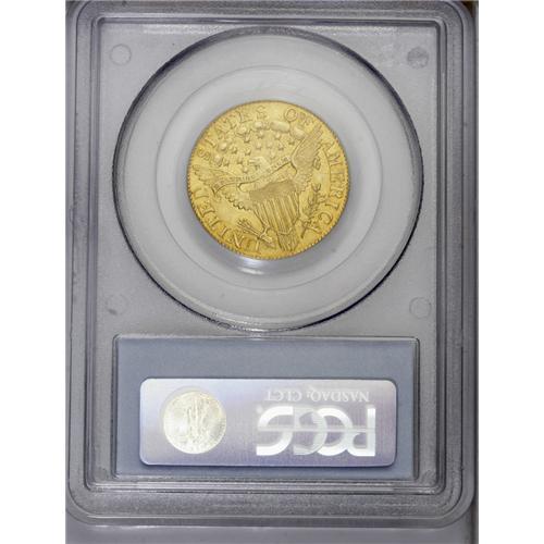<B>1806<$5> Pointed Top 6, 8x5 Stars AU55 PCGS.</B></I> Miller-75, Breen-6445. High R.4. Slight wear has had little impact of the fields' rather reflective luster, and the yellow-gold devices display pleasing detail on each side. The surfaces show scattered handling marks consistent with light circulation.