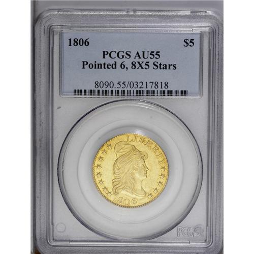 1806 $5 Pointed Top 6, 8x5 Stars AU55 PCGS. Miller-75,