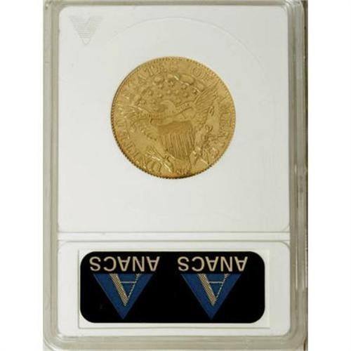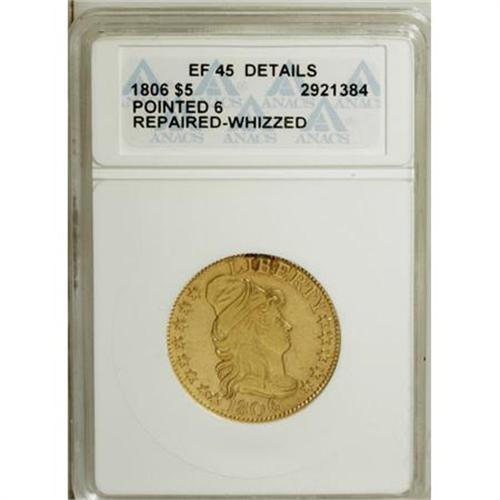 <B>1806 $5 Pointed Top 6, 8x5 Stars--Repaired, Whizzed--ANACS. XF45 Details.</B></I> Breen-6445, BD-1, R.4. Stars 1 and 2 touch on the obverse, and on the reverse all the T's in the legends are hobbled, lacking their right feet. In this later reverse die state, the rim break above the last S in STATES covers several dentils. Repaired on the reverse rim near 6 o'clock, and possibly repaired opposite above the B in LIBERTY. Thickly hairlined and unnaturally prooflike, but a collectible example of this elusive early gold type.<BR><BR><B>Coin Engraver:</B> Robert Scot<BR><BR><b>Shipping:</b> Coins & Currency (<a target="_blank" href="http://www.heritageauctions.com/common/shipping.php">view shipping information</a>)
