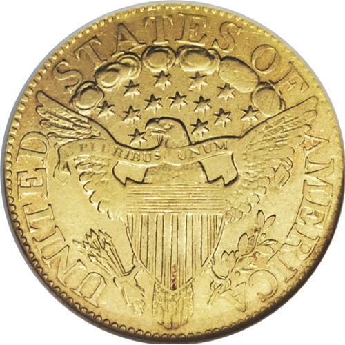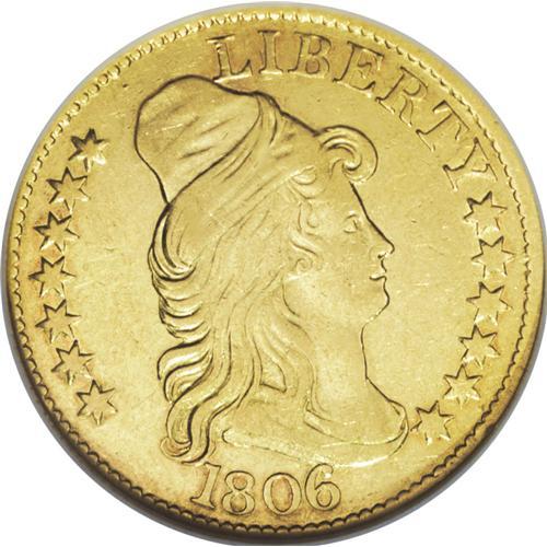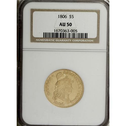 <B>1806 $5 Round Top 6, 7x6 Stars AU50 NGC.</B></I> Breen-6448, BD-6, R.2. A problem-free straw-gold Bust Right type coin with no shortage of glowing luster, particularly on the reverse. Half eagles were rarely seen in circulation until the bullion content of the denomination was reduced in 1834. Most pieces existed only briefly to facilitate foreign trade, and were promptly melted by their second owner.<BR><BR><b>Shipping:</b> Coin/Currency (<a target="_blank" href="http://www.heritageauctions.com/common/shipping.php">view shipping information</a>)