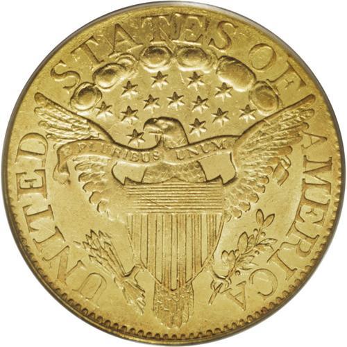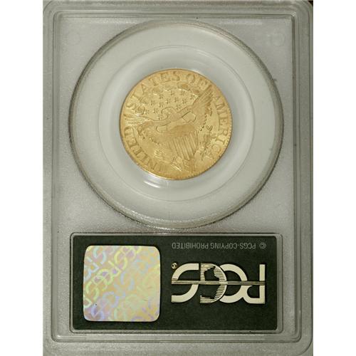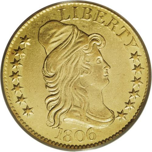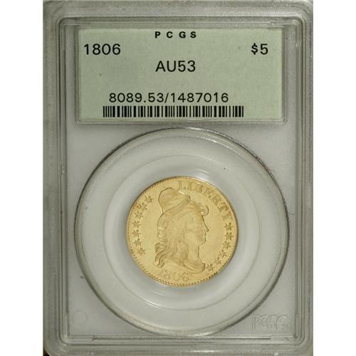 <B>1806 $5 Round Top 6, 7x6 Stars AU53 PCGS.</B></I> Breen-6448, BD-6, R.2. The knobbed 6 in the date touches the lower bust, and the 8 and 0 lean left. On the reverse the A's in AMERICA are noticeably smaller than the other letters. There are numerous raised die lines visible through NITE and RIC. This piece shows extensive but microscopic abrasions from circulation, along with much luster in the protected areas near the border and light yellow-gold coloration. There are few singular abrasions save for a minor scrape through the horizontal shield lines. An exemplary type coin, this variety is the most widely seen of the Draped Bust, Large Eagle fives. Certified in a green-label holder.<BR><BR><b>Shipping:</b> Coins & Currency (<a target="_blank" href="http://www.heritageauctions.com/common/shipping.php">view shipping information</a>)