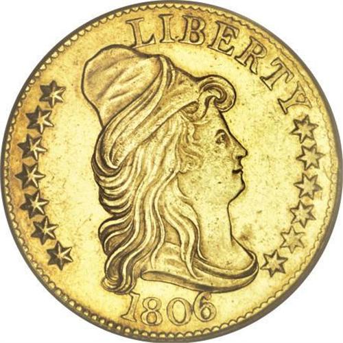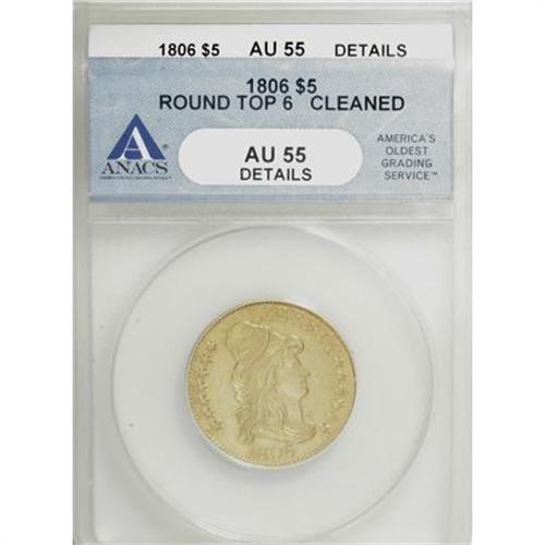 <B>1806 $5 Round Top 6, 7x6 Stars--Cleaned--ANACS. AU55 Details.</B></I> Breen-6448, BD-6, R.2. The fields are slightly more bright and reflective than they should be for a lightly circulated early half eagle, but substantial luster remains, and no marks merit mention. Well struck save for merging of detail on the shield. A few inconspicuous adjustment marks (as made) are concealed on reverse highpoints, and a small strike-through accompanies one of the reverse stars.<BR><I>Ex: ANA Centennial Auction (Bowers and Merena, 8/91), lot 542.</B></I><BR><I>From The John Stimson, Sr. Collection, Part Two.</B></I><BR><BR><B>Coin Engraver:</B> Robert Scot<BR><BR><b>Shipping:</b> Coins & Currency (<a target="_blank" href="http://www.heritageauctions.com/common/shipping.php">view shipping information</a>)