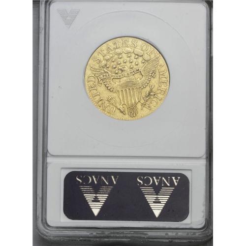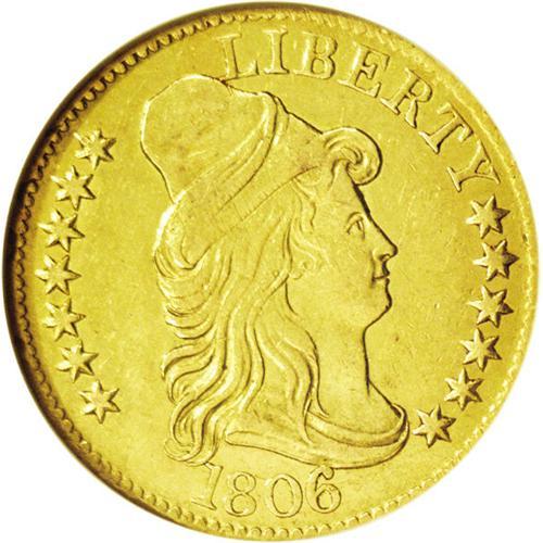 <B>1806<$5> Round Top 6, 7x6 Stars--Cleaned--ANACS. AU50 Details.</B></I> Breen-6448, B. 5-E, Miller-84, R.3. Although glossy from a relatively mild cleaning, this partly lustrous piece would be the highlight of most gold type sets. Some striking bluntness is seen on portions of the shield, and a few adjustment marks on the upper half of the portrait are also as made.