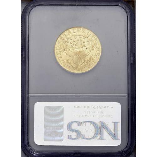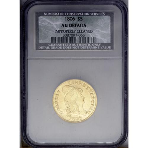 <B>1806<$5> Round Top 6, 7x6 Stars--Improperly Cleaned--CSN. AU Details.</B></I> Breen-6448, B. 5-E, Miller-84, R.3. Bright orange-gold surfaces are the result of a past cleaning. This coin may also have been slightly bent, but such a determination is difficult in the holder. Additional imperfections are also present. This should prove to be an affordable early half eagle that will appeal to many. <BR><BR><B>Important notice:</B> Heritage usually auctions material at the rate of 200-250 lots per hour. On some occasions eBay Live bid software or the Internet may not be able to keep up with the pace of the auction. We recommend placing a realistic absentee bid now as insurance to avoid disappointment. Occasionally the auctioneer may eliminate or reject an eBay Live bid, and the auctioneer may also reopen a lot after the close of the eBay live bidding (usually because we missed an audience bid), and may reject your bid even if it shows you as the winning bidder. By bidding via eBay Live, you agree that Heritage may award the lot to another bidder at its sole discretion under the circumstances described above or any other reasonable circumstances. Since eBay bids are not shown to us until we open the lot on the floor, we treat those bids just like floor bids. In most cases the floor responds before the eBay bid is presented to us, due to Internet lag time, so for consistency we have made it a policy that floor bids are always considered first over tie eBay live bids. Also please note that all Heritage lots purchased through eBay Live carry a 20% Buyer's Premium. Please make sure you read the Terms and Conditions before you bid. This lot is being auctioned in conjunction with a live floor auction by Heritage Galleries & Auctioneers. All final auction and invoice information will be supplied by Heritage Galleries & Auctioneers, and all other information should be considered preliminary. Lot:2620 <BR><BR><B>Winning Notification and Billing:</B> After the FINAL session in this auction is complete, Heritage will send e-mail and snail mail invoices. This process normally takes several days. All final auction and invoice information will be supplied by Heritage Galleries & Auctioneers, and all other information should be considered preliminary. <BR><BR>This auction will be conducted on a live auction floor and over the Internet through eBay Live. If you choose to place an absentee bid, please take a moment to <font color='#0000ff'><u><a href='http://pages.ebay.com/liveauctions/help/before/laabsentee.html'>learn how eBay Live absentee bidding works</a></u></font><font color='#000000'>