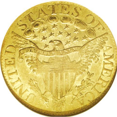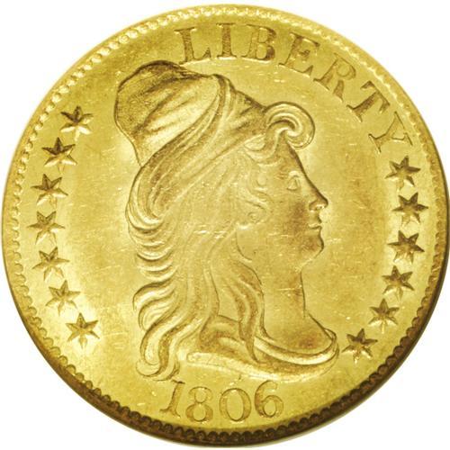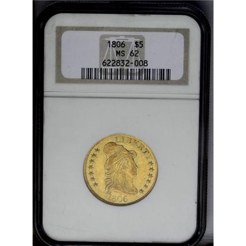 <B>1806<$5> Round Top 6, 7x6 Stars MS 62 NGC.</B></I> B. 5-E, Miller-84, R.2. Due to its status as the most readily available early half eagle, the 1806 7x6 Stars is a popular variety for high quality type purposes. Both sides of this coin exhibit a frosty, amber-gold sheen with deepening of tone on the highpoints that is clearly suggestive of originality. Although lightly abraded, as befits the grade, the surfaces are relatively attractive with nicely defined features. In sum, we wholeheartedly endorse this coin as a desirable Mint State representative of this popular gold series.