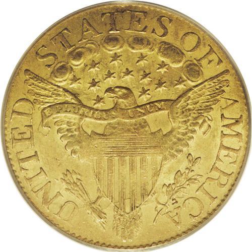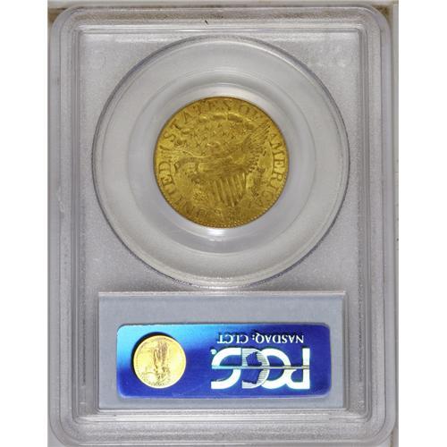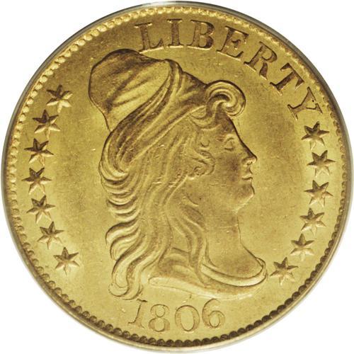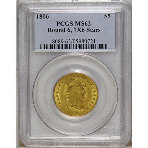 <B>1806 $5 Round Top 6, 7x6 Stars MS62 PCGS.</B></I> Breen-6448, BD-6, R.2. This is the familiar Knobbed 6 or Round Top 6 variety that is frequently encountered. It is an ideal variety for type collectors as it is seen more often in Mint State grades than any other variety of the Draped Bust design. In fact, there may be more Mint State survivors of this single design type than of all others combined! This lovely piece has rich greenish honey-gold color with frosty luster on both sides. Hints of orange toning can be seen on the highpoints of the design. Some central weakness of the design is noted on each side. This is a highly appealing Mint State example that deserves a good home with an appreciative collector.<BR><BR><b>Shipping:</b> Coins & Currency (<a target="_blank" href="http://www.heritageauctions.com/common/shipping.php">view shipping information</a>)