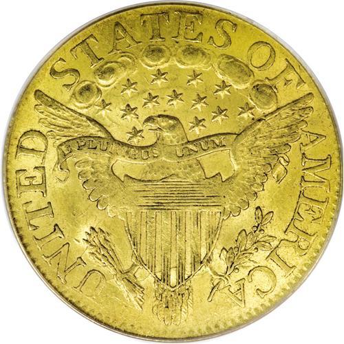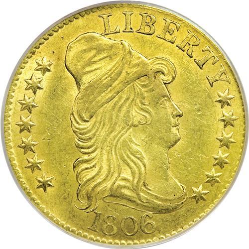<B>1806 $5 Round Top 6, 7x6 Stars MS62 PCGS.</B></I> Breen-6448, BD-6, R.2. The type collector should be pleased that this particular variety was produced, as it provides an excellent opportunity to acquire a high grade example of the design. There is no doubt that this variety is more plentiful in Mint State grades than any other single variety of early half eagle produced from 1795 to 1834, although the 1807 Bust Left and 1810 Large Date variety are close behind. Both sides exhibit typical central weakness, but are fully lustrous with frosty green-gold surfaces. A few scattered marks, including a small flake in the right obverse field, limit the grade of this piece.<BR><BR><b>Shipping:</b> Coins & Currency (<a target="_blank" href="http://www.heritageauctions.com/common/shipping.php">view shipping information</a>)