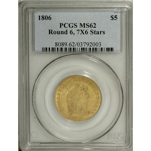 1806 $5 Round Top 6, 7x6 Stars MS62 PCGS. Breen-6448,