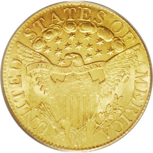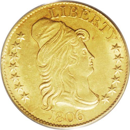 <B>1806<$5> Round Top 6, 7x6 Stars MS63 PCGS.</B></I> Breen-6448, B. 5-E, Miller-84, R.3. This variety, one of six die marriages for the year, is popular for type and easily distinguished by the knobbed-top 6 in the date and the arrangement of seven stars on the left, six on the right. There are a few mint-made adjustment marks visible on Liberty's cheek on the obverse and on the central reverse, and the strike is light on the shield, wings, and portions of the scroll. A wispy die crack proceeds from the left upright of the N in UNITED to the nearby arrowheads. The color is a lovely honey-gold, and a few light scrapes and abrasions, mostly visible under a loupe, confirm the grade. Despite a few trivial distractions, however, this is a lovely and highly desirable early type coin.