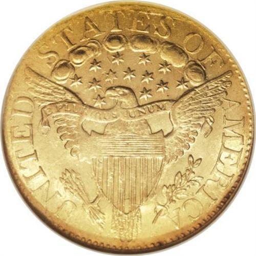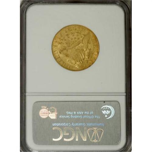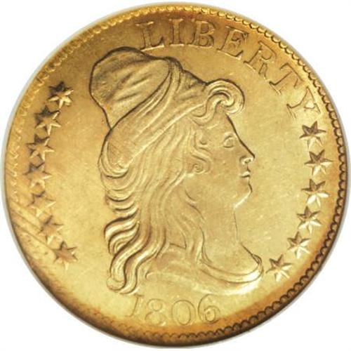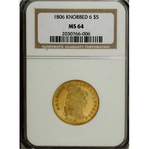<B>1806 $5 Round Top 6, 7x6 Stars MS64 NGC.</B></I> Breen-6448, BD-6, R.2. Bass-Dannreuther Obverse State d/Reverse State This is not only the most available die variety for 1806, it is also the most available Draped Bust, Large Eagle variety of any date. There were six varieties produced for the year, of which the five Pointed 6 variants range from R.4 to R.7, while this single Knobbed 6 variety is estimated at R.2, with 600-900 pieces known, according to the Bass-Dannreuther <I>Early U.S. Gold Coin Varieties</B></I> 1795-1834. John Dannreuther estimates that of the total mintage of 64,000 pieces for this year, 35,000 to 50,000 of them were of this variety. The Knobbed 6 obverse is also the first to show the rearrangement from 8+5 stars to 7+6 stars. <BR> This coin appears quite late in the life of both obverse and reverse dies, although the "elucidation" of those die states in the Bass-Dannreuther reference is fairly unclear. On the obverse, a rust lump appears on the upright of the R of LIBERTY, and the bottom curls of hair are thin from clashing and lapping in that area. On the reverse bold die clashing appears on the lower shield from Liberty's turban and forecurl, and other clashes appear in the left stars and clouds. A crack from the N in UNITED runs through the arrowheads, and another crack runs into the field below I(TED) from the eagle's left wing.<BR> Although this variety is a common one for early gold, this coin is far from common in either its state of preservation or its appeal. Radiant luster emanates from the apricot-gold surfaces tinged with greenish-gold, and extensive perusal is required to locate even the faintest scrapes near the reverse rim. A small patch of adjustment marks at 9 o'clock on the obverse is completely undistracting, and the continuation of those adjustment marks into the left field and hair is scarcely seen without magnification. As further testimony to this piece's conditional rarity, it is one of 14 so graded at NGC, exceeded only by a single MS65 at that service.<BR><BR><B>Coin Engraver:</B> Robert Scot<BR><BR><b>Shipping:</b> Coins & Currency (<a target="_blank" href="http://www.heritageauctions.com/common/shipping.php">view shipping information</a>)