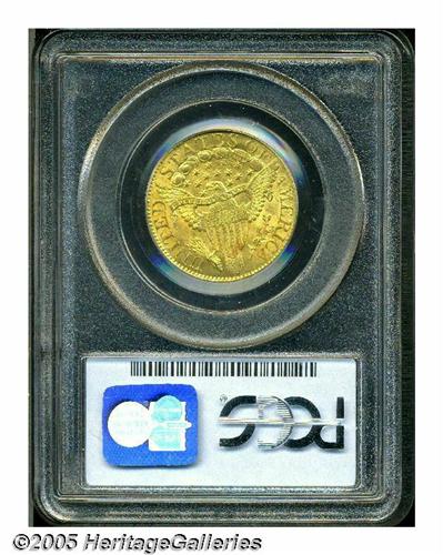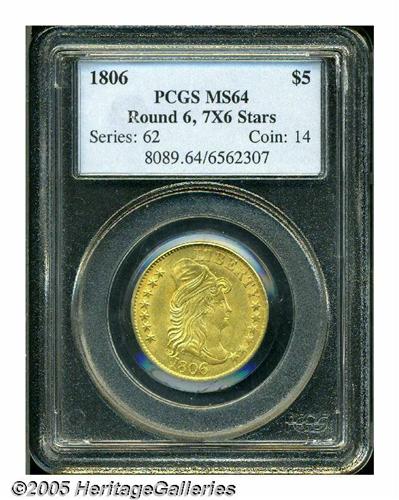 <B>1806<$5> Round Top 6, 7x6 Stars MS64 PCGS.</B></I> Breen-6448, B. 5-E, Miller-84, R.3. There are six die marriages of 1806-dated Eagles, but Breen 5-E is differentiated from the other varieties in two important ways. The 6 in the date ends with a knob instead of a point, and the stars are arranged seven left and six right instead of the usual eight by five arrangement. As a result, the right side stars are crowded when compared with their left side counterparts, since the right periphery is also shared with the legend LIBERTY. Sharply struck except for the right side obverse stars. The central reverse exhibits mint-made adjustment marks, but the lightly toned surfaces are free from bothersome contact. Population: 36 in 64, 1 finer (4/05).