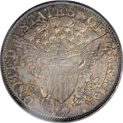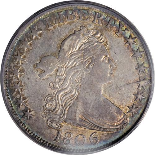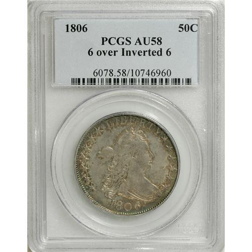 <B>1806 50C 6 Over Inverted 6 AU58 PCGS.</B></I> O-112, R.4. A scarce and important Draped Bust half. Obverse 7 is seen here with a die crack in the right field that extends to the neck of Liberty. On the reverse, the right base of the F in OF is missing, and the eagle's beak is joined to a star point. According to Stephen Herrman's spring 2007 census of scarce and rare early halves, the finest coin that has been sold of this variety was an XF45 ten years ago. There are numerous coins available in the Fine-Very Fine grade range, but the numbers thin out quickly above that. This is undoubtedly a Condition Census example of this popular Red Book variety. The surfaces are bright with a dusky overlay of gray, especially on the highpoints, and deep rose and blue toning around the margins.<BR><BR><b>Shipping:</b> Coins & Currency (<a target="_blank" href="http://www.heritageauctions.com/common/shipping.php">view shipping information</a>)