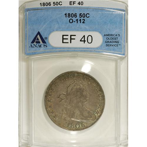 <B>1806 50C 6 Over Inverted 6 XF40 ANACS.</B></I> O-112, R.4. The die breaks through star 11 and vertically across the portrait confirm the scarce O-112 die marriage. Ocean-blue, plum-mauve, and olive envelop this partly lustrous and attractively defined example.<BR><I>From The Hoosier Discovery Collection.</B></I><BR><BR><b>Shipping:</b> Coins & Currency (<a target="_blank" href="http://www.heritageauctions.com/common/shipping.php">view shipping information</a>)