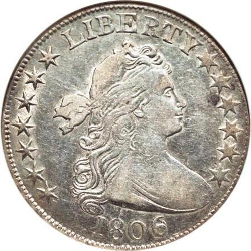 <B>1806 50C 6 Over Inverted 6 XF45 NGC.</B></I> O-111a, R.3. As Obverse 7 and Reverse H continued to strike halves, the dies progressively deteriorated. The obverse on this piece shows a crack that is invisible on the earlier state, running diagonally from the rim through the E in LIBERTY. Another, even-longer crack extends from the smaller one, beginning below the 8 in the date through almost the entire figure of Liberty and nearly meets the crack through E. While not as pronounced as it will be seen later, the dual-plane effect of this vertical crack can be faintly seen, with much better definition on the left-side obverse stars than those on the right side. On the reverse, the rim-to-rim break over UN is seen as a retained cud, but the crack over TED is a full cud with that piece of the die completely gone. <BR> The silver-gray surfaces show a slight accent of golden-tan patina over the highpoints of the devices. Numerous small abrasions are scattered over each side, but all are consistent with a coin that has seen 15 points of circulation. <BR> When one examines the auction appearances of O-111a in Stephen Herrman's reference, a curious Condition Census is apparent. The two finest coins recorded are a 64/64 followed by a 60/63 (the Norweb coin). The next finest is a 45/45, placing this piece as tied for third finest for the die state.<BR><I>Provenance unknown.<BR>From The Westmoreland County Collection of Early Bust Halves, Part Two.</B></I><BR><BR><b>Shipping:</b> Coins & Currency (<a target="_blank" href="http://www.heritageauctions.com/common/shipping.php">view shipping information</a>)