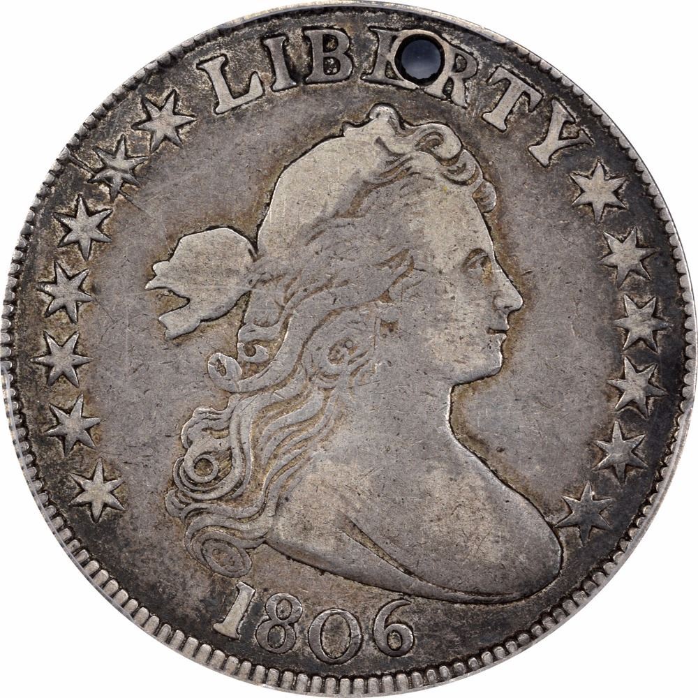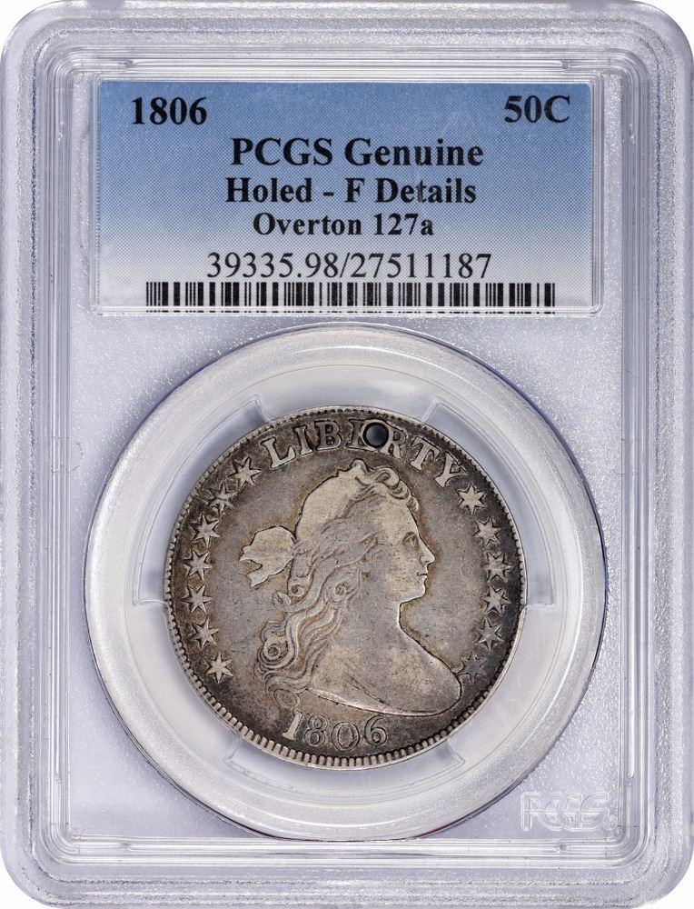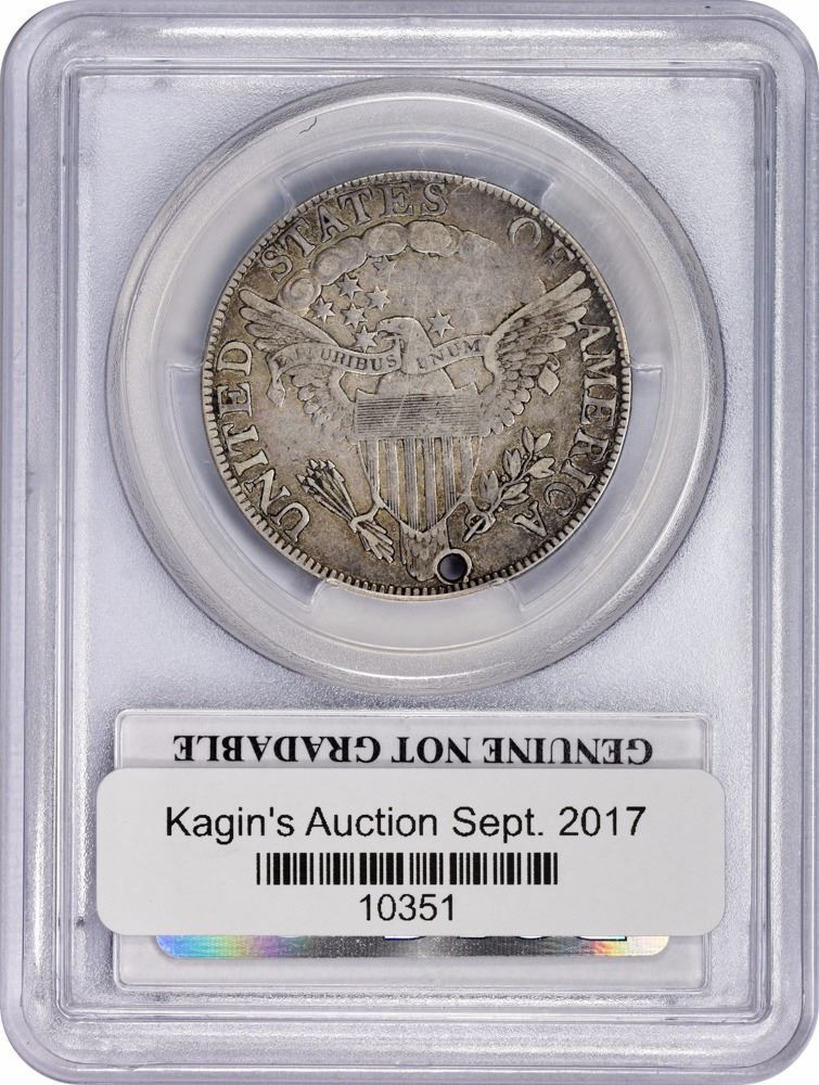 This recently certified example of Overton-127a is one of about 20 known specimens – a VF-25 example rules the roost at PCGS and is purported to be the finest known of the rare variety. Deep steel-gray with rose and slate highlights throughout. Entirely unmarked to the unaided eye except, of course, for the small hole drilled at ER on the obverse, and through the tail feathers on the reverse. There are hundreds of members of the Bust Nut Half Club nationwide, but fewer than two dozen members of that prestigious organization will ever own an example of O-127a. This coin may have a hole, but so does your collection – sometimes “filler” quality is the only option. Here come the experts!