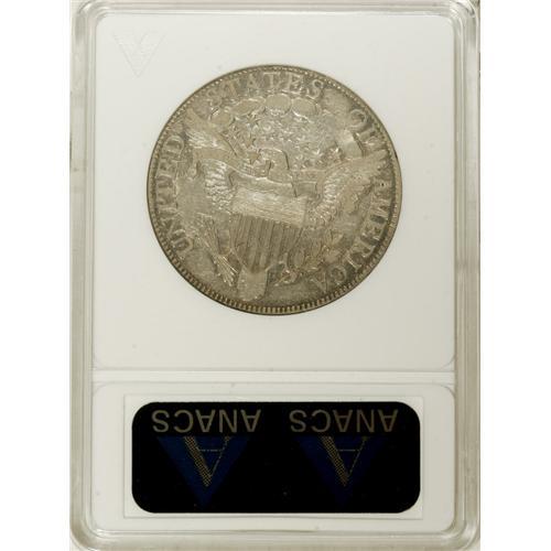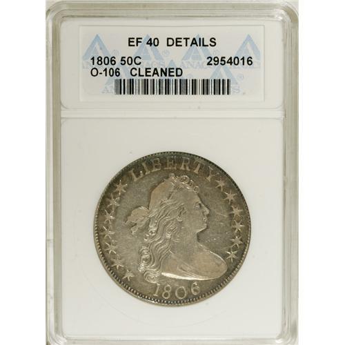 <B>1806 50C Knob 6, Small Stars--Cleaned--ANACS. XF40 Details.</B></I> O-106, R.4. Electric-blue and chestnut toning embraces the borders of this mildly cleaned piece. Luster emerges from the hair, plumage, and legends. Typically struck on the bust tip and the opposite cloud.<BR><I>From The Hoosier Discovery Collection.</B></I><BR><BR><b>Shipping:</b> Coins & Currency (<a target="_blank" href="http://www.heritageauctions.com/common/shipping.php">view shipping information</a>)