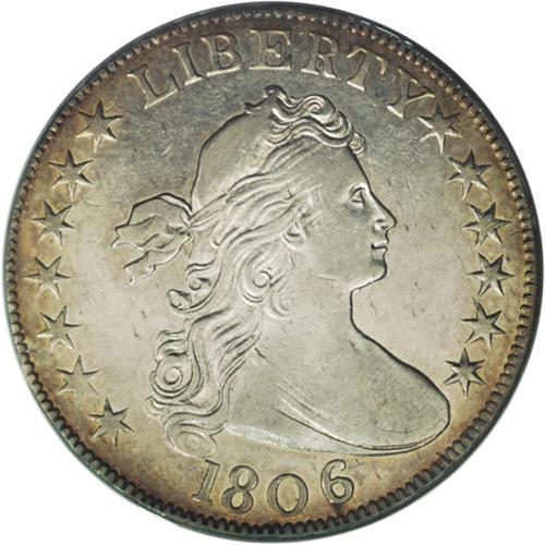<B>1806 50C Knob 6, Small Stars XF45 ANACS.</B></I> O-106, R.4. A better variety Draped Bust half that has a golden-brown obverse border and brilliant centers. The reverse displays a generous amount of prooflike luster, and the surfaces are refreshingly smooth. The devices are boldly struck aside from the rightmost two clouds.<BR><I>From The Hoosier Discovery Collection.</B></I><BR><BR><b>Shipping:</b> Coins & Currency (<a target="_blank" href="http://www.heritageauctions.com/common/shipping.php">view shipping information</a>)