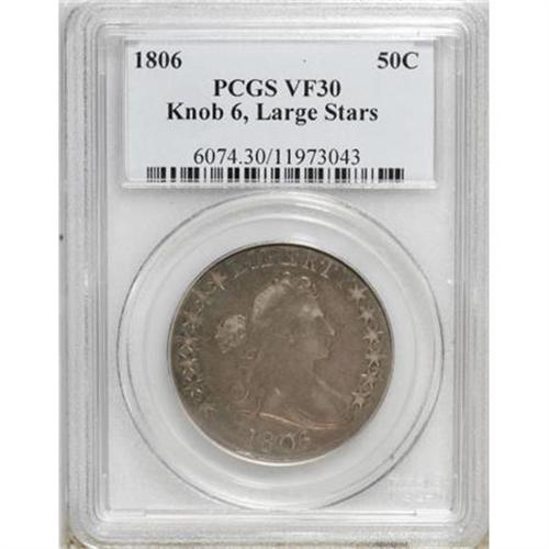 <B>1806 50C Knobbed 6, Large Stars VF30 PCGS.</B></I> . PCGS Population (7/24). NGC Census: (0/0). Numismedia Wsl. Price for NGC/PCGS coin in VF30: $869. (#6074)<BR><BR><B>Coin Engraver:</B> Robert Scot<BR><BR><b>Shipping:</b> Coins & Currency (<a target="_blank" href="http://www.heritageauctions.com/common/shipping.php">view shipping information</a>)