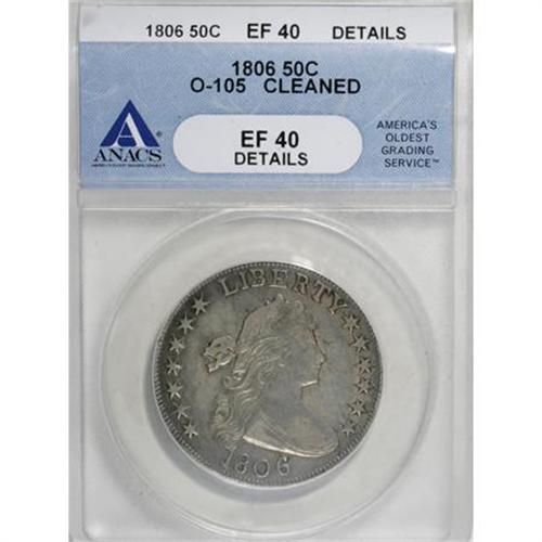 <B>1806 50C Knobbed 6, Large Stars--Cleaned--ANACS. XF40 Details. </B></I>O-105. NGC Census (0/0). PCGS Population (6/11). Numismedia Wsl. Price for NGC/PCGS coin in XF40: $1325.<BR><BR><B>Coin Engraver:</B> Robert Scot<BR><BR><b>Shipping:</b> Coins & Currency (<a target="_blank" href="http://www.heritageauctions.com/common/shipping.php">view shipping information</a>)