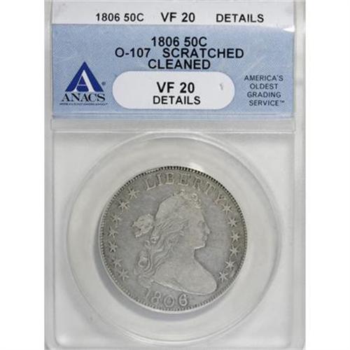 <B>1806 50C Knob 6, Stem--Cleaned, Scratched--ANACS. VF20 Details. </B></I>O-107. NGC Census (0/0). PCGS Population (2/35). Numismedia Wsl. Price for NGC/PCGS coin in VF20: $450.<BR><BR><B>Coin Engraver:</B> Robert Scot<BR><BR><b>Shipping:</b> Coins & Currency (<a target="_blank" href="http://www.heritageauctions.com/common/shipping.php">view shipping information</a>)