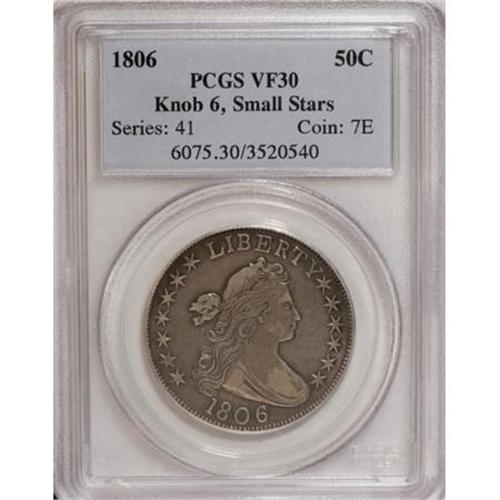 <B>1806 50C Knobbed 6, Small Stars VF30 PCGS.</B></I> O-106, R.4. Liberty's hair, the eagle's wings, the shield, and E PLURIBUS UNUM all exhibit splendid sharpness. Only the two rightmost clouds are softly defined, as usual for the type since they are opposite the bust tip. Cream-gray with dusky olive-green near the rims. Population: 13 in 30, 18 finer (1/08).<BR><BR><B>Coin Engraver:</B> Robert Scot<BR><BR><b>Shipping:</b> Coins & Currency (<a target="_blank" href="http://www.heritageauctions.com/common/shipping.php">view shipping information</a>)