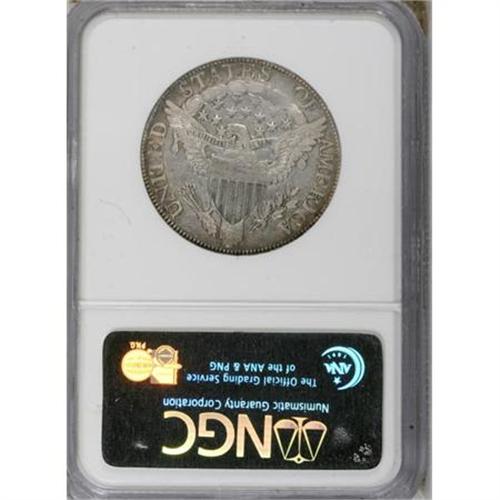 <B>1806 50C Knobbed 6, Small Stars VF35 NGC.</B></I> O-106, R.4. The obverse has the 1 in the date partly under the curl and a knobbed 6, and the reverse shows a leaf pair pointing between the I and C of AMERICA. Well struck with moderate wear and a subtle sheen to the surfaces. The centers are predominantly cloud-gray and steel-gray, while the margins display elements of violet and orange.<BR><BR><B>Coin Engraver:</B> Robert Scot<BR><BR><b>Shipping:</b> Coins & Currency (<a target="_blank" href="http://www.heritageauctions.com/common/shipping.php">view shipping information</a>)