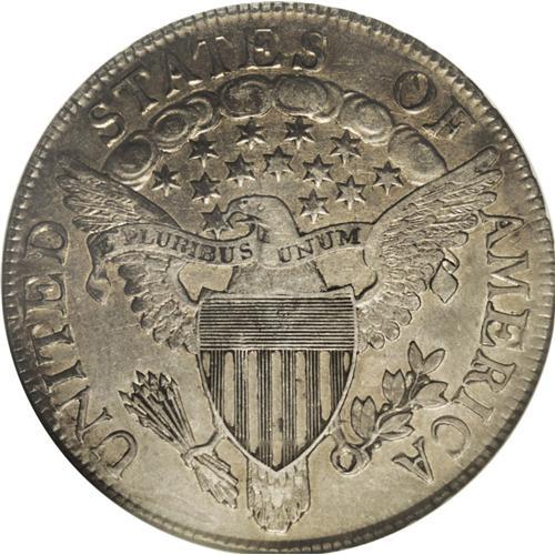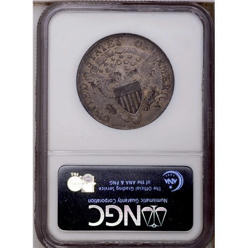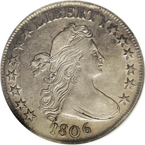 <B>1806<50C> Pointed 6, No Stem AU55 NGC.</B></I> O-109, R.1. The only variety that combines the pointed 6 in the date with a stemless olive branch, the latter the result of an engraver's error. The medium gray fields are accented with sea-green and rose-golden hues as the coin turns under a light. Relatively free from abrasions, the surfaces have only light wear. A few degrees of counterclockwise die rotation are seen.