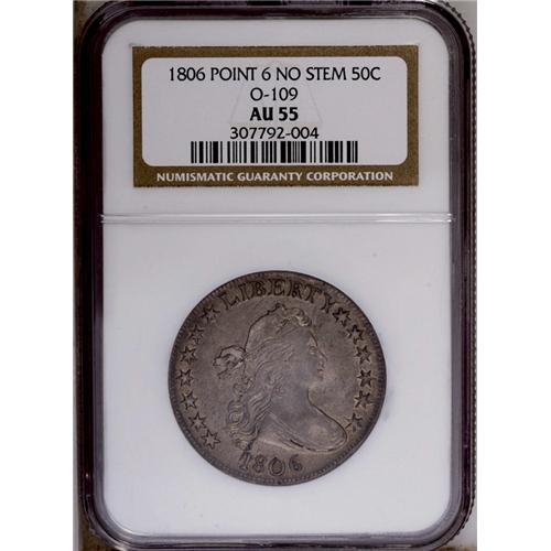 1806 50C Pointed 6, No Stem AU55 NGC. O-109, R.1. The 1806[50C] Pointed 6, No Stem AU55 NGC.