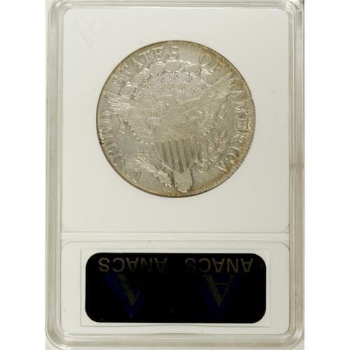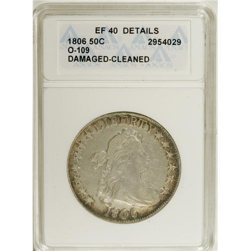 <B>1806 50C Pointed 6, No Stem--Damaged, Cleaned--ANACS. XF40 Details.</B></I> O-109, R.1. Sun-gold and navy-blue enrich the margins and frame the cloudy ivory-gray centers. Mildly granular beneath the hair ribbon, and small roundish depressions are located near obverse star 5 and the E in UNITED.<BR><I>From The Hoosier Discovery Collection.</B></I><BR><BR><b>Shipping:</b> Coins & Currency (<a target="_blank" href="http://www.heritageauctions.com/common/shipping.php">view shipping information</a>)