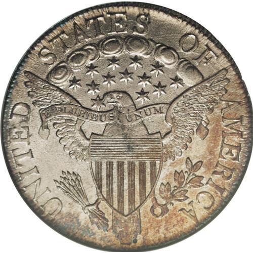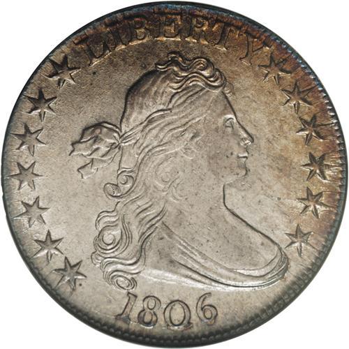 <B>1806 50C Pointed 6, No Stem MS61 NGC.</B></I> O-109a, R.4. This popular variety is an engraving blunder. No stem was added to the olive branch, and the branch appears to be growing out of the eagle's claw instead of being clutched by the eagle. The scarce die state with the bold crack from star 12 toward Liberty's neck. A lightly abraded example with blushes of orange and fire-red near the right borders.<BR><BR><b>Shipping:</b> Coins & Currency (<a target="_blank" href="http://www.heritageauctions.com/common/shipping.php">view shipping information</a>)