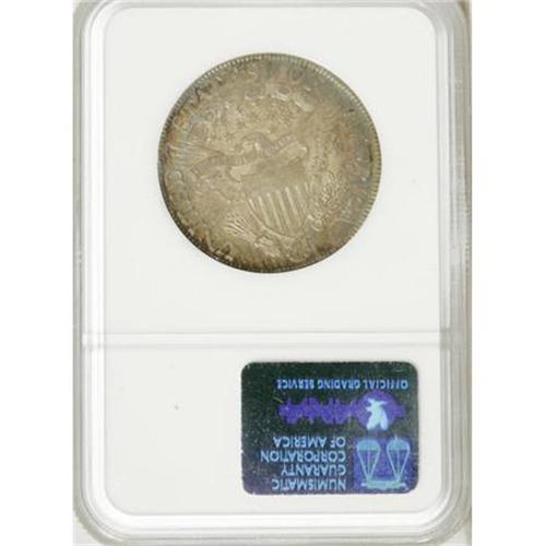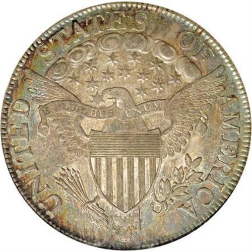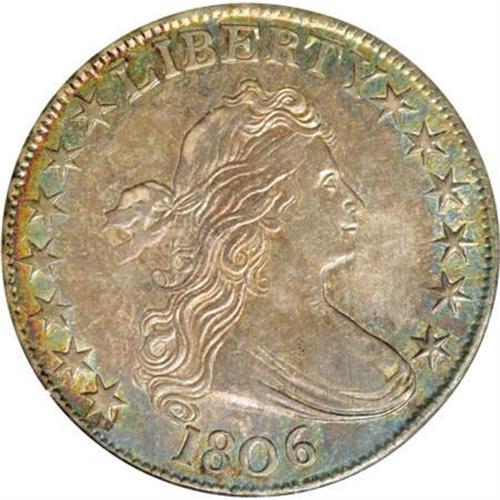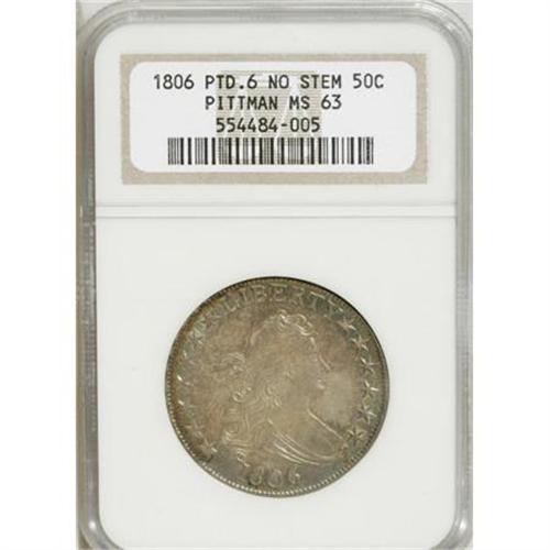 <B>1806 50C Pointed 6, No Stem MS63 NGC.</B></I> O-109, R.1. The proliferation of punch styles continued through 1806 with the use of the Pointed Top 6 for the remainder of the year. As pointed out in Overton, this is the only usage of this Pointed 6 numeral punch in the entire series. The O-109 is also the only variety where the stem does not pierce the eagle's claw. <BR> Remarkably well detailed and a nicely centered impression. Both sides have frosty mint luster that retains its full brilliance beneath a kaleidoscope of color. The surfaces of this Select piece have a few minor abrasions and hairlines, but the overall eye appeal is exceptional<BR> As one would expect from an R.1 variety, there are numerous Uncirculated examples known. However, at the MS63 level, this piece is tied with at least four others as third finest known. Because of the exceptionally high grade of this piece and the importance of this single-use die pairing as a type coin, this half is elevated to one of the highlights of the Westmoreland Collection. <BR> Haseltine-9, Beistle 1-A, Overton-16-18, PCGS # 6071, Encyclopedia-4589.<BR><I>Ex: Barney Bluestone (4/1947), lot 1051; John Jay Pittman (David Akers, 5/1998), lot 1449.<BR>From The Westmoreland County Collection of Early Bust Halves, 1794-1807.</B></I><BR><BR><B>Coin Engraver:</B> Robert Scot<BR><BR><b>Shipping:</b> Coins & Currency (<a target="_blank" href="http://www.heritageauctions.com/common/shipping.php">view shipping information</a>)