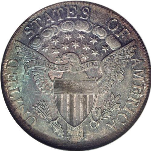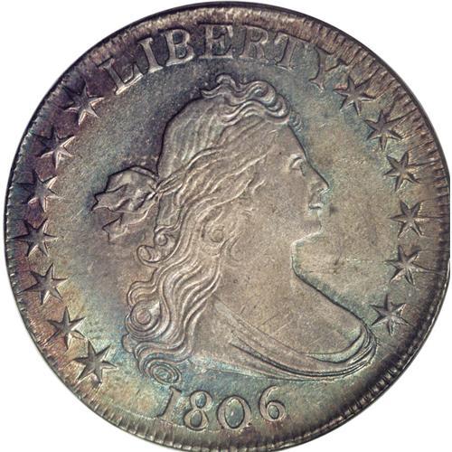 <B>1806<50C> Pointed 6, No Stem MS64 NGC.</B></I> O-109a, R.4. This better Overton variety shows a prominent die crack that runs from star 12 directly outward into the right obverse field, and the crack through the 180 in the date is heavy, with a lump broken out from the right base of the 0. A crack from above star 2 runs through stars 4 and 5. Light clash marks and die rust show above the date. The No Stem reverse has five berries, the upper three of which have long stems. The present example shows lovely jade-green centers and yellow-gold margins on both sides, with abundant, unimpeded luster. The coin is well, if not boldly struck, and moderate die erosion draws the stars and legends toward the rims on each side. The surfaces are largely pristine of after-minting distractions and essentially pristine.