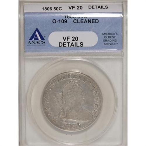 <B>1806 50C Pointed 6, No Stem--Cleaned--ANACS. VF20 Details.</B></I> O-109. Mintage: 839,576. Numismedia Wsl. Price for NGC/PCGS coin in VF20: $425. (#6073)<BR><BR><B>Coin Engraver:</B> Robert Scot<BR><BR><b>Shipping:</b> Coins & Currency (<a target="_blank" href="http://www.heritageauctions.com/common/shipping.php">view shipping information</a>)