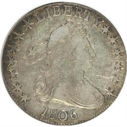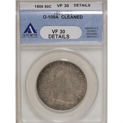<B>1806 50C Pointed 6, No Stem--Cleaned--ANACS. VF30 Details.</B></I> O-109a. Mintage: 839,576. Numismedia Wsl. Price for NGC/PCGS coin in VF30: $815. (#6073)<BR><BR><B>Coin Engraver:</B> Robert Scot<BR><BR><b>Shipping:</b> Coins & Currency (<a target="_blank" href="http://www.heritageauctions.com/common/shipping.php">view shipping information</a>)