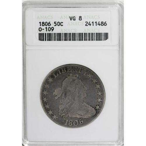 <B>1806 50C Pointed 6, No Stem VG8 ANACS. O-109. </B></I>PCGS Population (5/172). (#6073)<BR><BR><B>Coin Engraver:</B> Robert Scot<BR><BR><b>Shipping:</b> Coins & Currency (<a target="_blank" href="http://www.heritageauctions.com/common/shipping.php">view shipping information</a>)