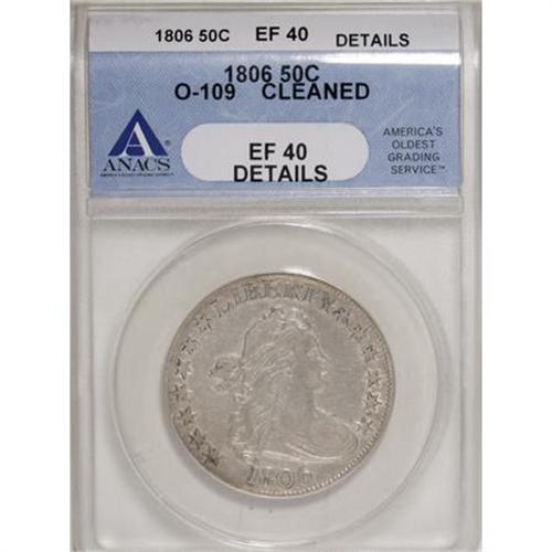 <B>1806 50C Pointed 6, No Stem--Cleaned--ANACS. XF40 Details.</B></I> O-109. Mintage: 839,576. Numismedia Wsl. Price for NGC/PCGS coin in XF40: $1,400. (#6073)<BR><BR><B>Coin Engraver:</B> Robert Scot<BR><BR><b>Shipping:</b> Coins & Currency (<a target="_blank" href="http://www.heritageauctions.com/common/shipping.php">view shipping information</a>)