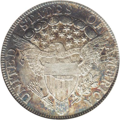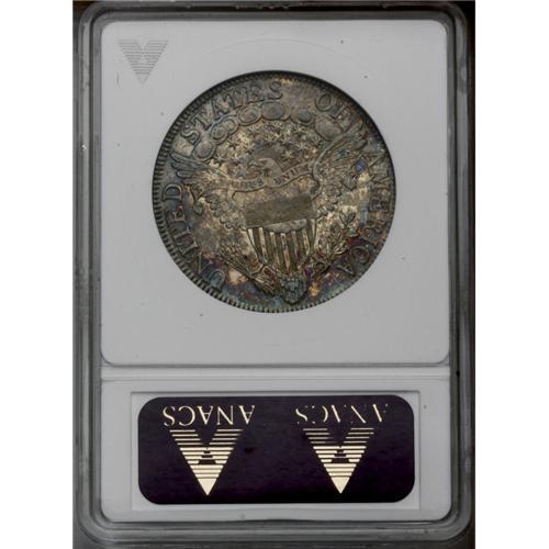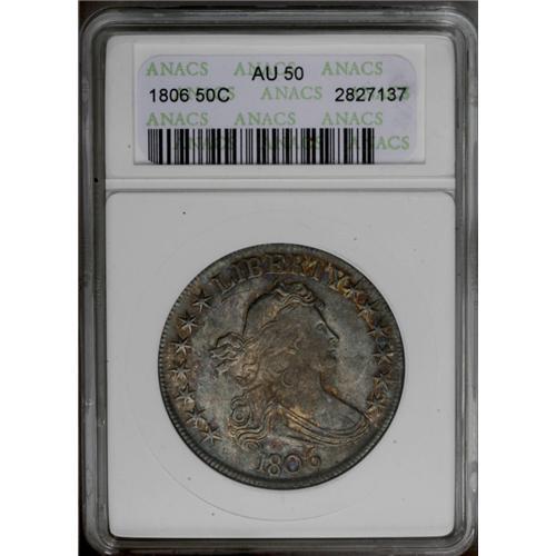 <B>1806<50C> Pointed 6, Stem AU50 ANACS.</B></I> O-120a, all breaks, R.5. Likely the terminal die state with a prominent die breaks or 'cuds' atop the fourth vertical stripe of the shield and below the eagle's right (facing) wing. The surfaces are somewhat bright and glossy beneath turquoise and burnt-orange toning. <BR><BR><B>Important notice:</B> Heritage usually auctions material at the rate of 200-250 lots per hour. On some occasions eBay Live bid software or the Internet may not be able to keep up with the pace of the auction. We recommend placing a realistic absentee bid now as insurance to avoid disappointment. Occasionally the auctioneer may eliminate or reject an eBay Live bid, and the auctioneer may also reopen a lot after the close of the eBay live bidding (usually because we missed an audience bid), and may reject your bid even if it shows you as the winning bidder. By bidding via eBay Live, you agree that Heritage may award the lot to another bidder at its sole discretion under the circumstances described above or any other reasonable circumstances. Since eBay bids are not shown to us until we open the lot on the floor, we treat those bids just like floor bids. In most cases the floor responds before the eBay bid is presented to us, due to Internet lag time, so for consistency we have made it a policy that floor bids are always considered first over tie eBay live bids. Also please note that all Heritage lots purchased through eBay Live carry a 20% Buyer's Premium. Please make sure you read the Terms and Conditions before you bid. This lot is being auctioned in conjunction with a live floor auction by Heritage Galleries & Auctioneers. All final auction and invoice information will be supplied by Heritage Galleries & Auctioneers, and all other information should be considered preliminary. Lot:1928 <BR><BR><B>Winning Notification and Billing:</B> After the FINAL session in this auction is complete, Heritage will send e-mail and snail mail invoices. This process normally takes several days. All final auction and invoice information will be supplied by Heritage Galleries & Auctioneers, and all other information should be considered preliminary. <BR><BR>This auction will be conducted on a live auction floor and over the Internet through eBay Live. If you choose to place an absentee bid, please take a moment to <font color='#0000ff'><u><a href='http://pages.ebay.com/liveauctions/help/before/laabsentee.html'>learn how eBay Live absentee bidding works</a></u></font><font color='#000000'>