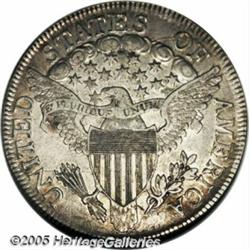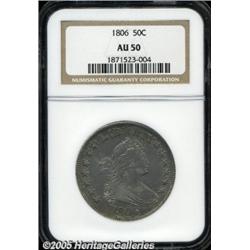 <B>1806 50C Pointed 6, Stem AU50 NGC.</B></I> O-115, R.1. Substantial luster glimmers across the borders and devices. The original golden-brown and battleship-gray patina is moderate and attractive. A short pinscratch beneath the B in LIBERTY is of little notice. For Overton-115, the TY in LIBERTY is recut, and the lowest berry has no stem. Both sides exhibit prominent mint-made clashmarks.