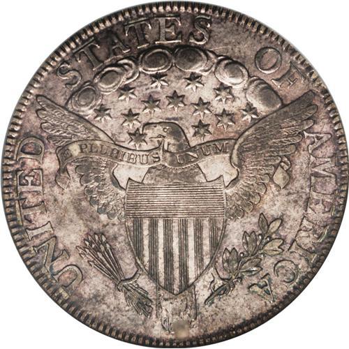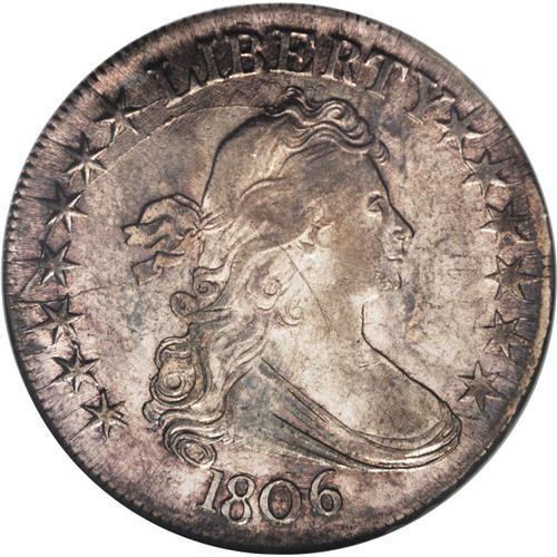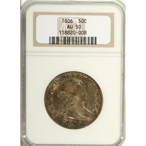 <B>1806 50C Pointed 6, Stem AU50 NGC.</B></I> O-121, R.4. The bases of AME virtually touch, while the left side of the obverse has several bold die cracks. The portrait has a pair of relatively unobtrusive pinscratches, though the extensive luster and original mauve-gray patina reinforce the eye appeal. Struck from a clashed obverse die.<BR><BR><b>Shipping:</b> Coin/Currency (<a target="_blank" href="http://www.heritageauctions.com/common/shipping.php">view shipping information</a>)